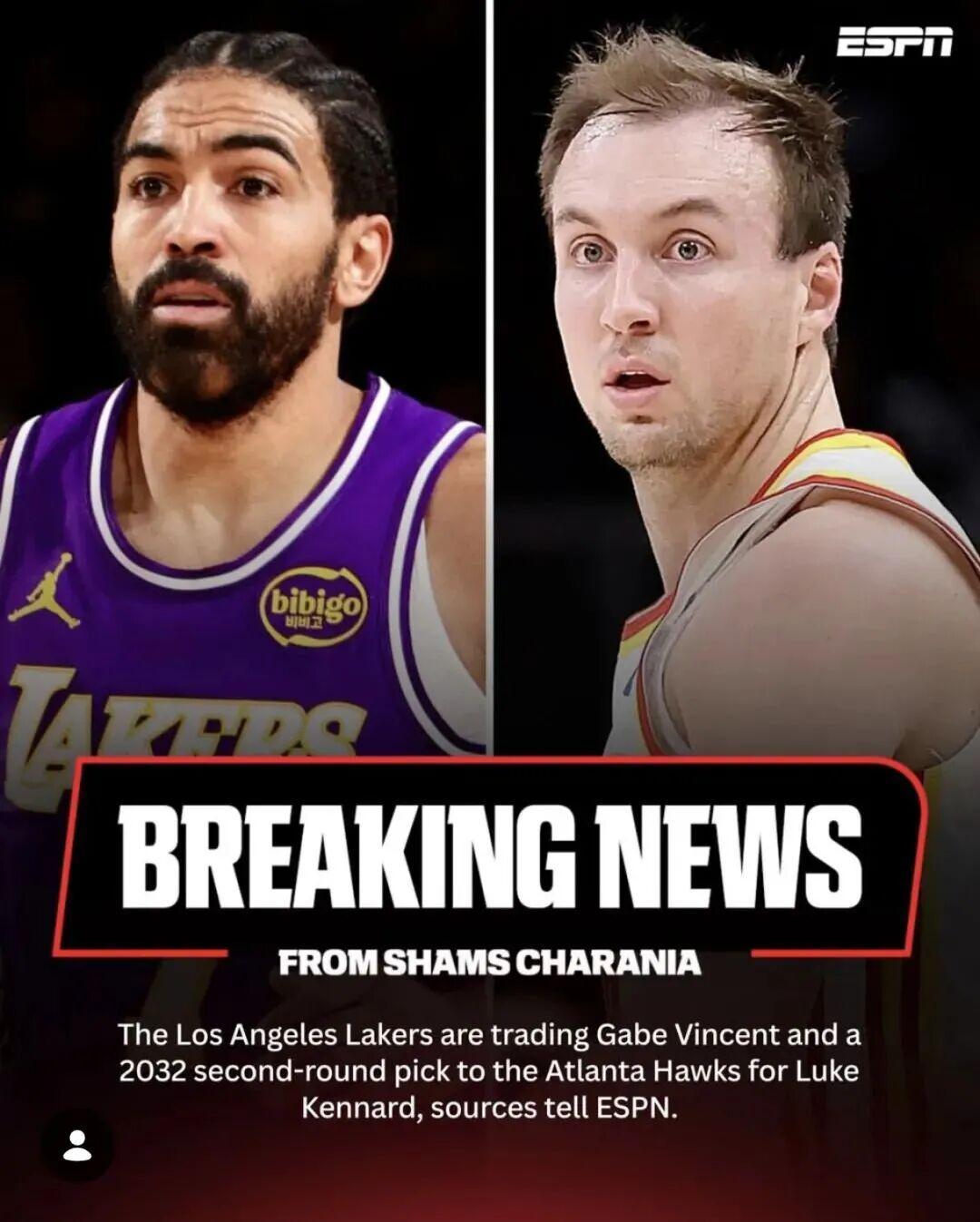 据Shams报道,湖人将盖布-文森特和一个2032年的次轮签送到老鹰,得到卢克-肯纳德